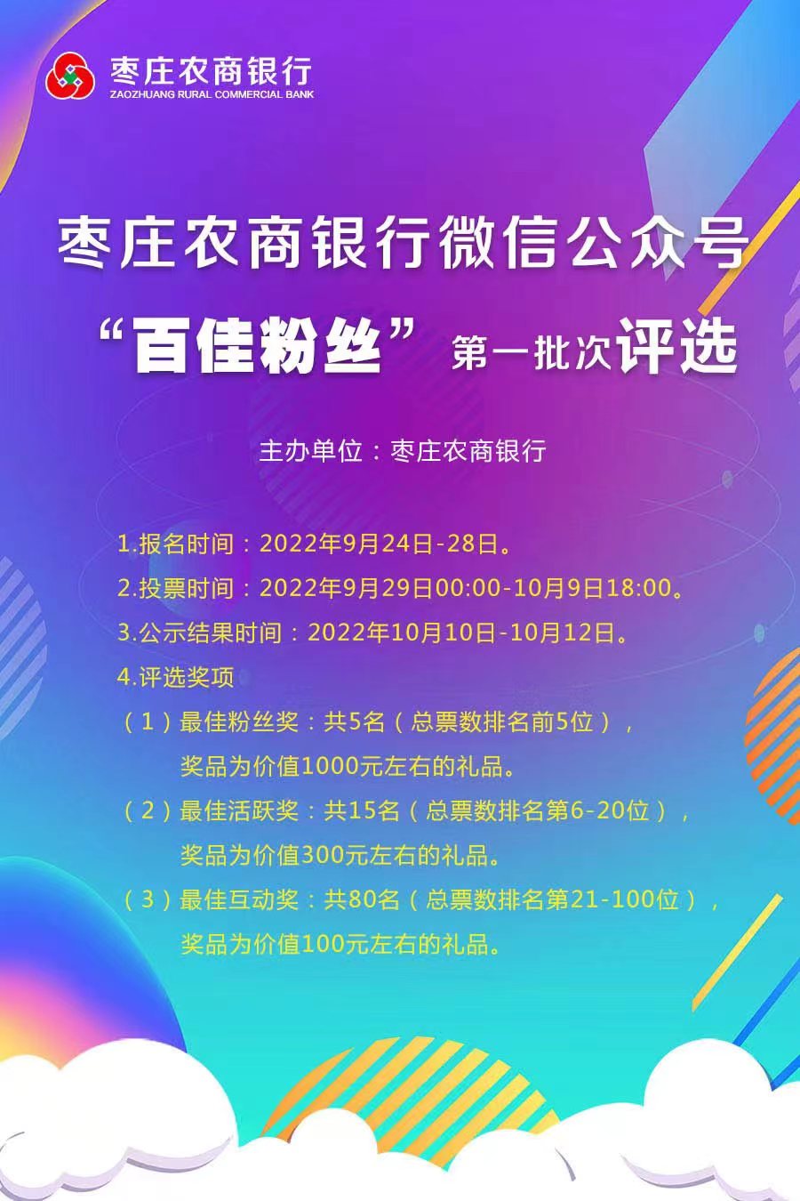 為強(qiáng)化線上自媒體宣傳,加大微信公眾號(hào)推廣力度,棗莊農(nóng)商銀行開(kāi)展“百佳粉絲”第一批次評(píng)選活動(dòng),回饋廣大公眾號(hào)粉絲的熱切關(guān)注,感謝廣大客戶長(zhǎng)期以來(lái)對(duì)棗莊農(nóng)商銀行的關(guān)心與支持。最終評(píng)選出的粉絲可獲贈(zèng)神秘大禮一份,同時(shí)對(duì)所有關(guān)注公眾號(hào)并參加了投票的粉絲均可參與抽獎(jiǎng)活動(dòng),更有機(jī)會(huì)獲得精美禮品一份。